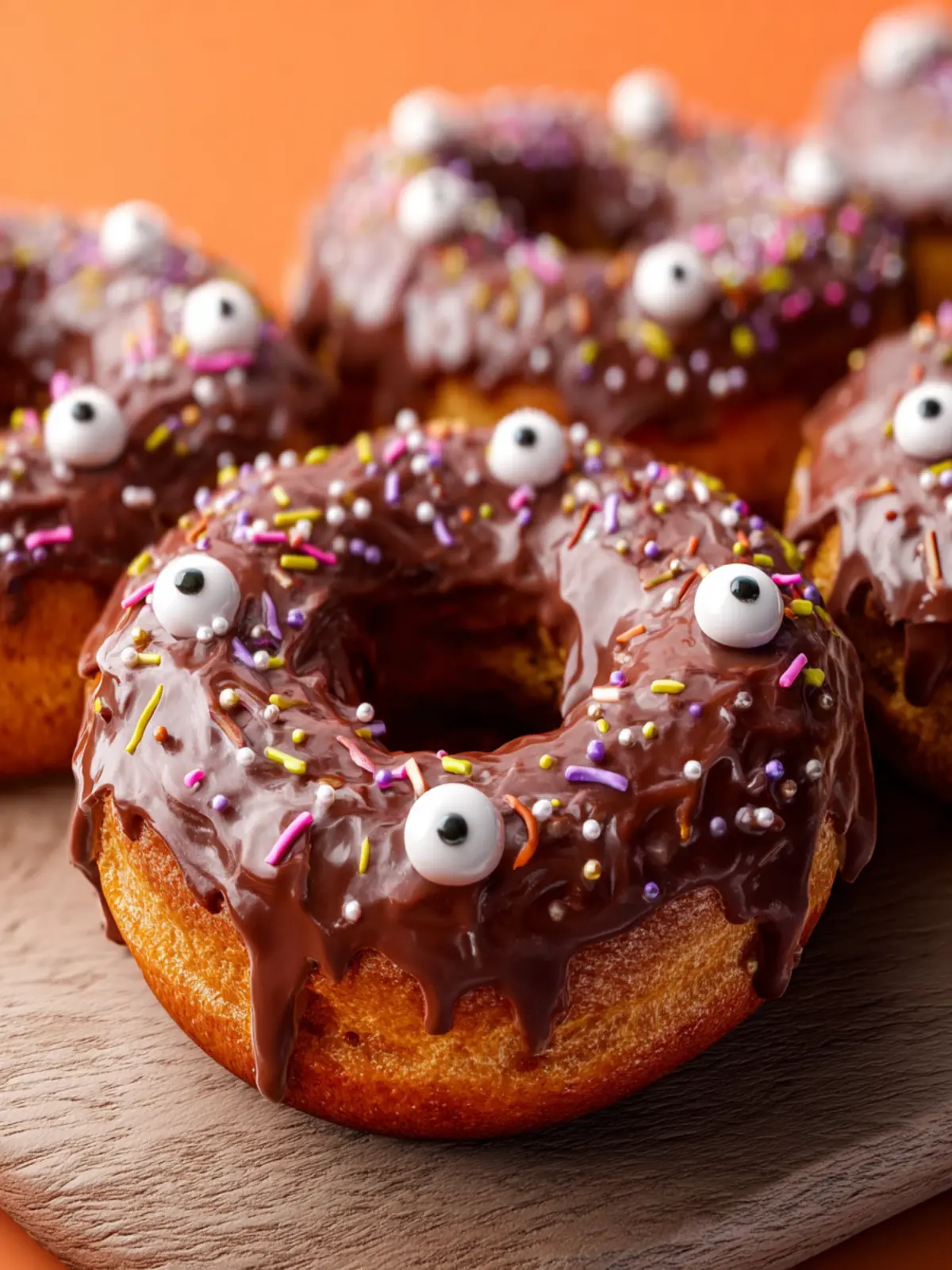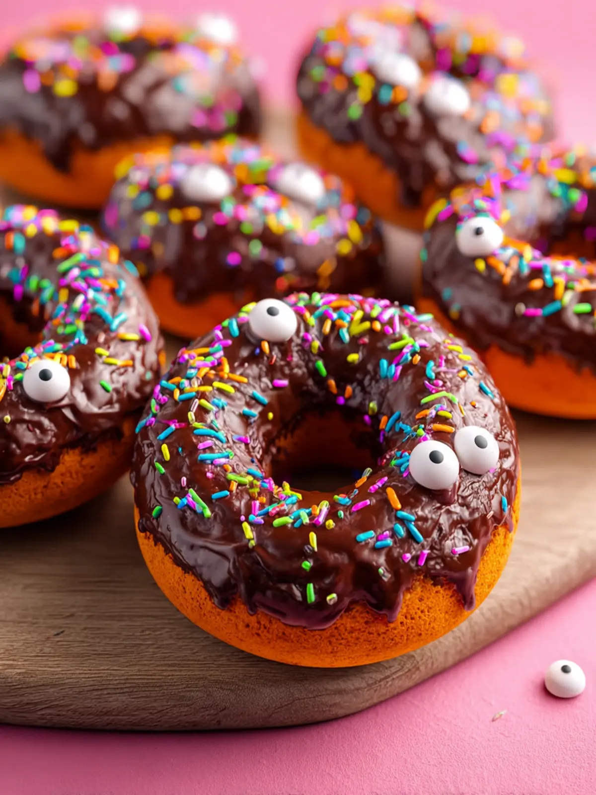 Delicious chocolate cake donuts topped with chocolate frosting and festive sprinkles.