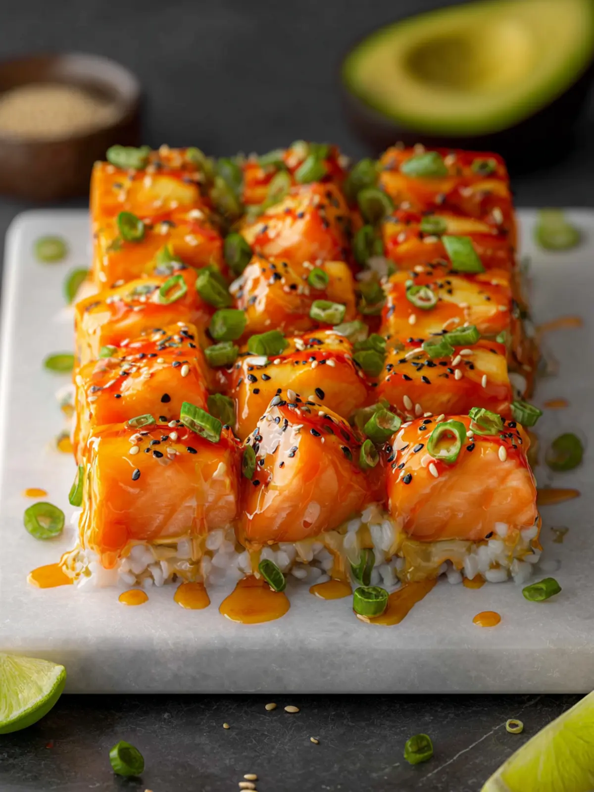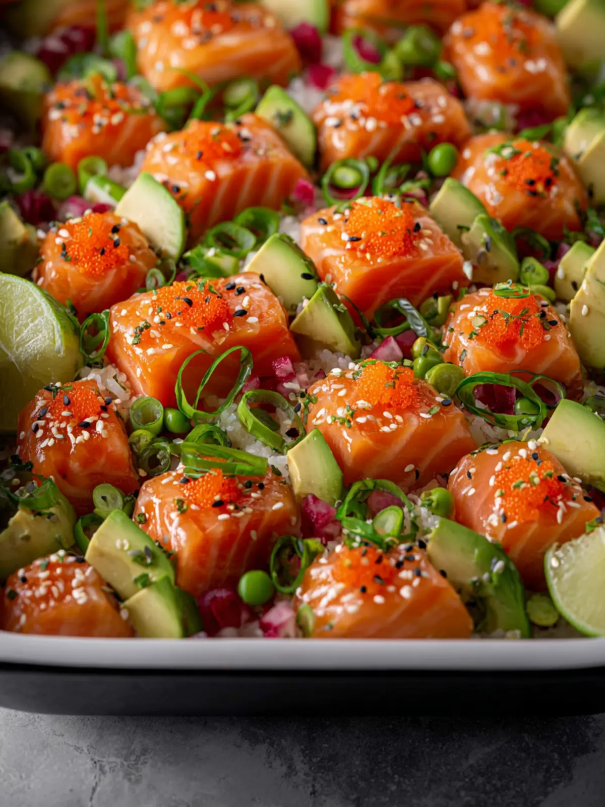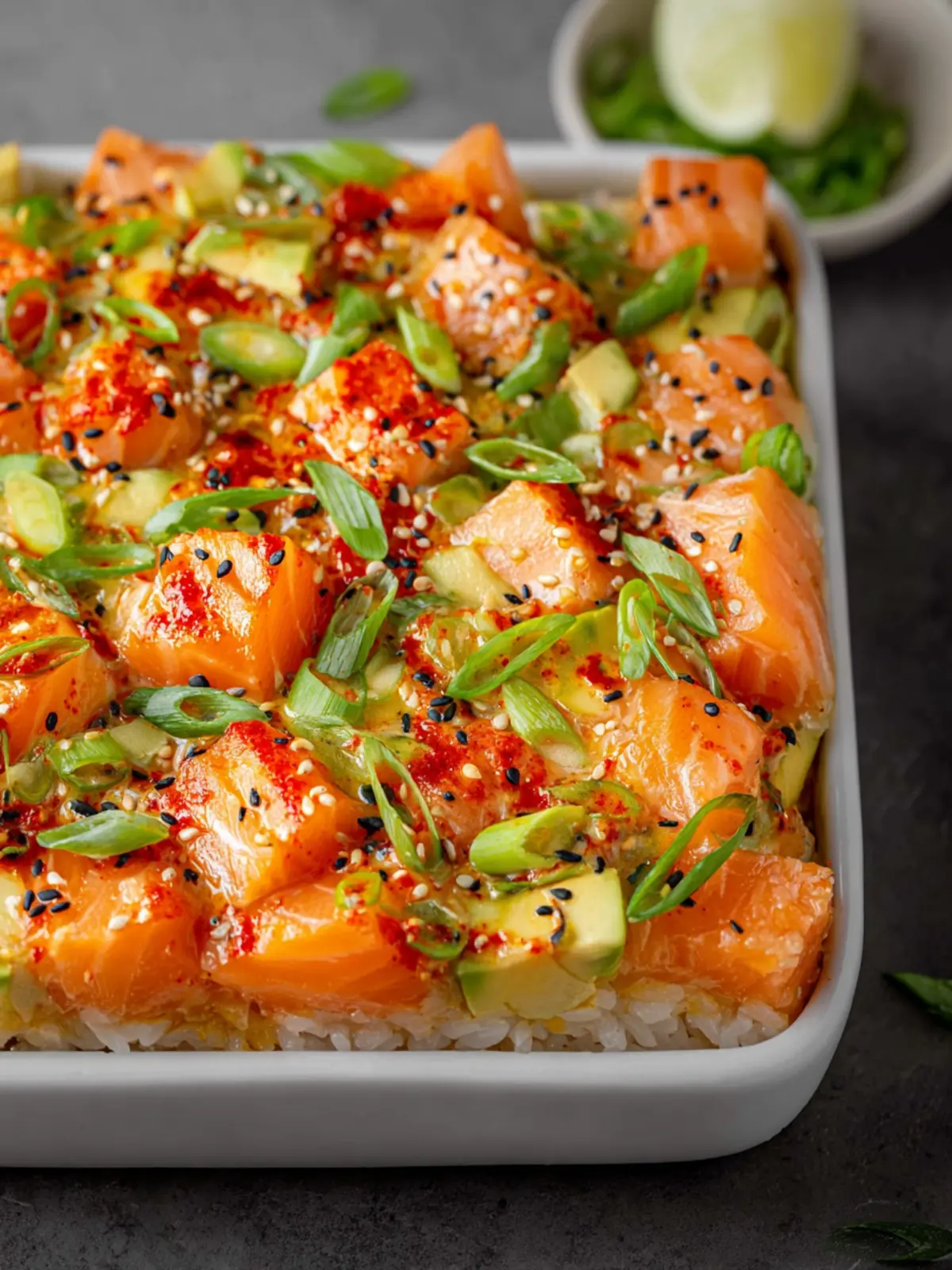 A delicious and easy salmon sushi bake that combines sushi rice, fresh vegetables, and a flavorful salmon topping.